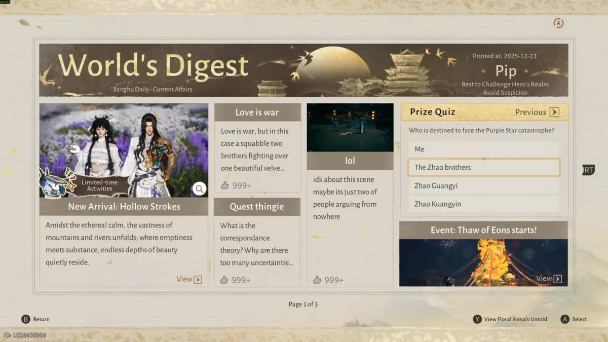 If you came here from Reddit, you probably need the Prize Quiz pick. But some long-form lore pages use similar phrasing for Jianghu Legacy quests. Here’s the clean separation: